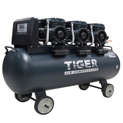ปั๊มลมออยฟรี TIGER JAGUAR150 ใช้งานกับไฟบ้านหรือ220โวลต์ขนาดถัง 150 ลิตร กับกำลังมอเตอร์รอบเร็วกำลังวัตต์ต่อตัวที่ 1390 วัตต์ หรือเทียบเท่า 2 hp ซึ่งถ้ารวมทั้งหมดแล้วเป็นลมที่มีกำลังมอเตอร์ 8 hp และที่สำคัญตัวมอเตอร์เป็นทองแท้ร้อยเปอร์เซ็น ข้อดีคือกำลังไฟที่เสถียรและอายุการใช้งานที่ยาวนาน สามารถสั่งการเปิดปิดมอเตอร์ได้บนปุ่มสวิตช์บนหน้าจอคอนโทรล สามารถสั่งการให้มอเตอร์ทำงาน 1 ตัว 2ตัว 3หรือ4ตัวก็ได้ หากงานไม่ได้เร่งรีบหรือเกิดไฟตกระหว่างใช้งาน ก็สามารถสั่งให้มอเตอร์ทำงานแค่ 2หรือ3 ตัวก็ได้ ด้านท่อลมหรือวาว์ลต่อสายลมใช้งานก็มีมาให้ 2ตัว 2ขนาด มี 2หุน(¼) กับ 4หุน(½) พร้อมเกจวัดแรงดันในถัง 1 ตัว สายไฟที่ให้มาจะไม่มีหัวมาให้ เนื่องด้วยมอเตอร์กินกำลังไฟค่อนเยอะจึงเหมาะสำหรับต่อเข้าเบรกเกอร์จะปลอดภัยกว่า