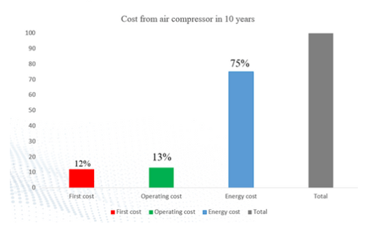 ตามหลัก Life cycle cost analysis ในระบบอากาศอัดที่มีอายุการใช้งาน10 ปีจะแบ่งค่าใช้จ่ายเป็นดัง