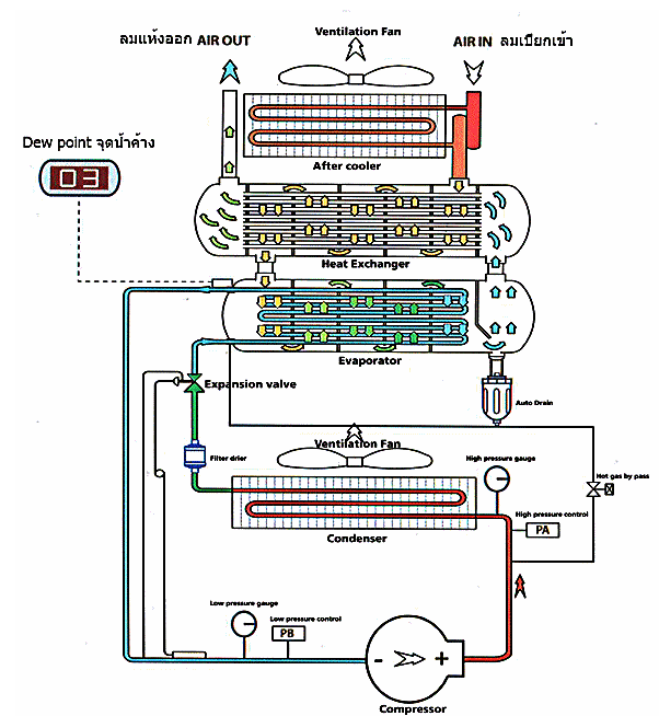 วงจรลมอัด : ลมอัดหลังจากออกจากเครื่องอัดลม เข้าถังพักลมมาแล้วก็จะเข้าสู่คอยเย็นของเครื่องทำลมแห้ง(Air dryer) แลกเปลี่ยนอุณหภูมิกับน้ำยาทำความเย็นที่มีอุณหภูมิต่ำ ผลทำให้น้ำที่ผสมอยู่กับลมอัดกลั่นตัวออก แล้วระบายออกผ่านทางตัวระบายน้ำอัตโนมัติ จากนั้นลมก็จะส่งออกจากเครื่องทำลมแห้ง สถานะแห้ง แต่ลมนี้ ไม่ได้แห้ง 100% เนื่องจากปกติแล้วจุดน้ำค้าง (Dew point) อยู่ระหว่าง 2 ถึง 10 องศาเซลเซียส ซึ่งจะเป็นอุณหภูมิที่เป็นบวกอยู่ซึ่งไม่ได้ติดลบทำให้ยังมีความชื้นบางส่วนปนไปกับลมได้