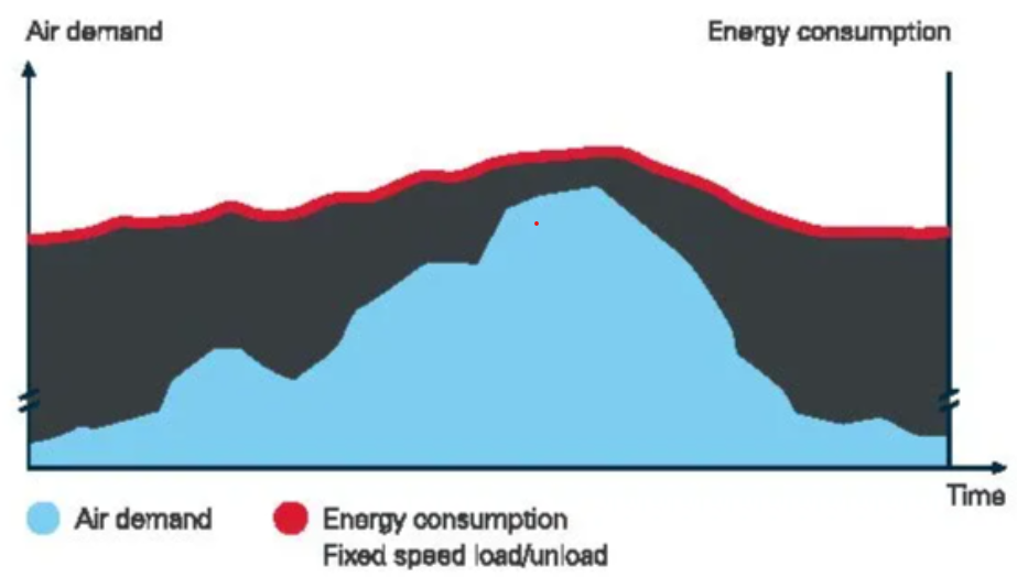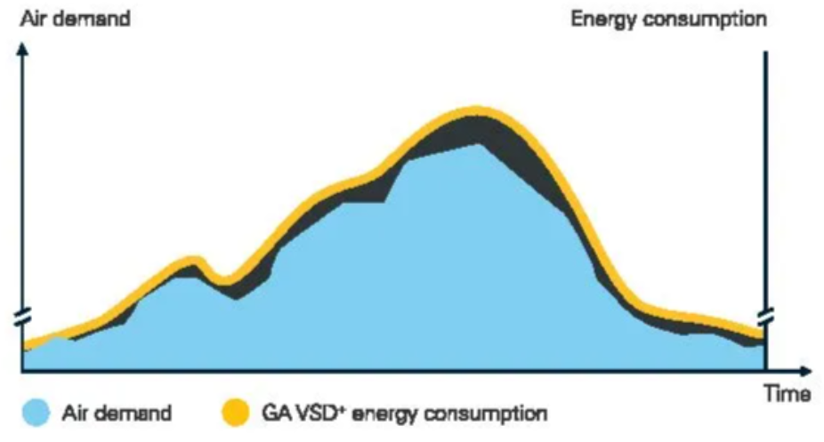 เทคโนโลยีแบบปรับความเร็วได้ (VSD)นั้นทำงานแตกต่างออกไป เพราะเครื่องเหล่านี้จะปรับความเร็วมอเตอร์ให้เป็นความเร็วที่่เหมาะสมเพื่อให้สัมพันธ์กับปริมาณความต้องการของลมอัดที่โรงงานต้องการ ตัวอย่างเช่น เมื่อระบบการผลิตมีความต้องการลมอัดเพิ่มขึ้นจะส่งผลให้ความเร็วรอบของมอเตอร์ก็จะเพิ่มขึ้นด้วย ในทางตรงกันข้ามถ้าความต้องการของลมอัดลดลง มอเตอร์จะทำงานช้าลงโดยอัติโนมัติและจะใช้ไฟเท่าที่จำเป็นเท่านั้นเพื่อกำหนดปริมาณการไหลของลมอัดที่เหมาะสม แอร์คอมเพรสเซอร์แบบ VSD นั้นเหมาะกับความต้องการพื้นฐานของการผลิตเพราะมันเทคโนโลยีที่สามารถคำนวนปริมาณการไหลของลมที่ถูกใช้และปรับความเร็วให้เหมาะสม ในวันที่กำลังการผลิตช้าลงและมีการพักตลอดทั้งวัน(หรือในช่วงกะที่สองและสาม) นั้นเทคโนโลยี VSD มีประโยชน์อย่างยิ่งที่ช่วยลดการใช้ไฟที่ไม่จำเป็นและยังช่วยประหยัดเงินอีกด้วย
